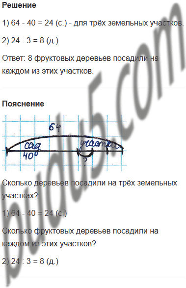 Задание № 64. Фермер купил 64 саженца фруктовых деревьев. Из них 40 саженцев - для сада, а остальные - для трёх земельных участков поровну. Сколько фруктовых деревьев посадили на каждом из этих участков?