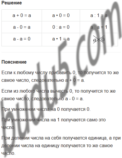 | а + 0 = ... | а • 0 = ... | а : 1 = ... |