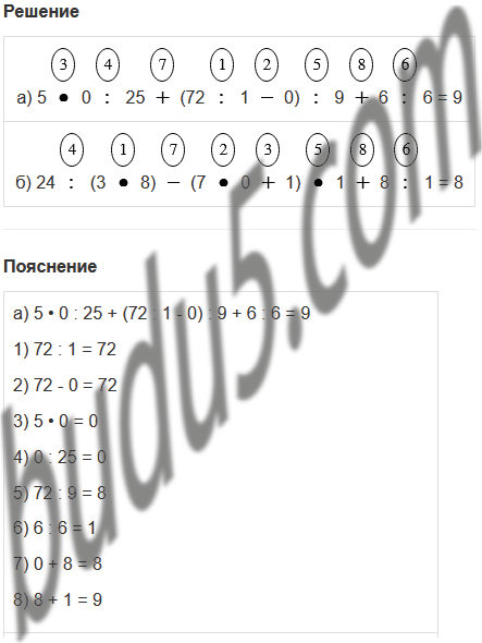 | а) 5 • 0 : 25 + (72 : 1 - 0) : 9 + 6 : 6 |