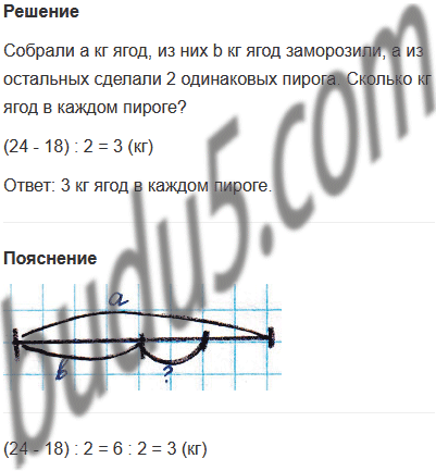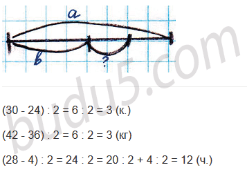 б) В мешке было а кг крупы. Из них израсходовали b кг, а остальную крупу рассыпали поровну в 2 пакета. Сколько килограммов крупы в каждом из этих пакетов? (а = 42, b = 36)