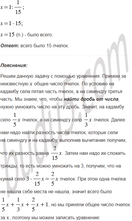 (Задача Бхаскары.) Есть кадамба цветок: на один лепесток пчёлок пятая часть села. Рядом росла вся в цвету симендга, и на ней третья часть разместилась. Разность их ты найди, затем трижды её сложи, на кумай этих пчёл посади. Только пчёлка одна не нашла себе места нигде, всё летала туда и сюда, запахом цветов наслаждалась. И скажи мне теперь, сколько пчёлок всего здесь собралось?