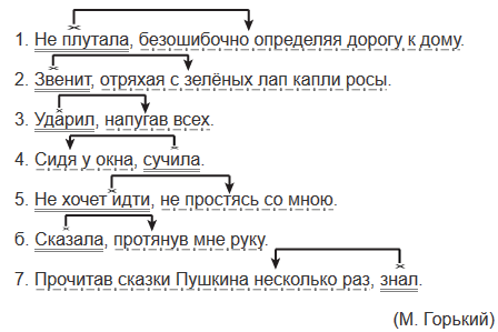 1. Бабушка никогда не ллутала в лесу, безошибочно определяя дорогу к дому. 2. Надо мною звенит хвойный лес, отряхая с зелёных лап капли росы. 3. Где-то близко ударил гром, напугав всех. 4. Сидя у окна, бабушка сучила нитки для кружев. 5. Девочка капризничает, не хочет идти спать, не простясь со мною. б. «Прощай, до завтра», — сказала девочка, протянув мне руку. 7. Прочитав сказки Пушкина несколько раз, я уже знал их на память.