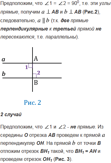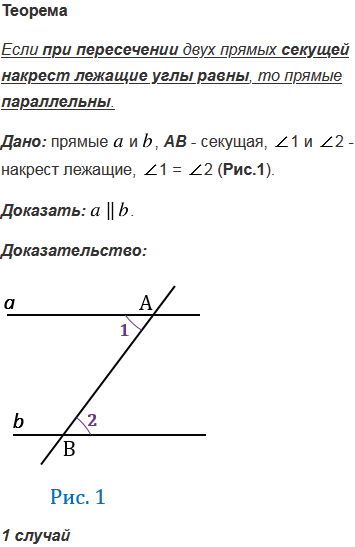 Докажите, что если при пересечении двух прямых секущей накрест лежащие углы равны, то прямые параллельны.
