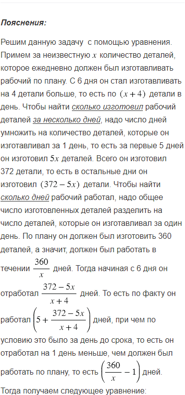Рабочий должен был за некоторое время изготовить 360 деталей. Первые 5 дней он ежедневно изготавливал запланированное количество деталей, а затем ежедневно изготавливал на 4 детали больше, и уже за день до срока изготовил 372 детали. Сколько деталей ежедневно должен был изготавливать рабочий по плану?