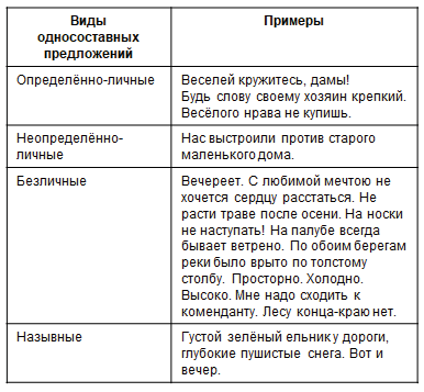 Виды односоставных предложений