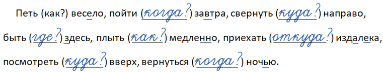 Петь (как?) весело, пойти (когда?) завтра, свернуть (куда?) направо, быть (где?) здесь, плыть (как?) медленно, приехать (откуда?) издалека, посмотреть (куда?) вверх, вернуться (когда?) ночью.