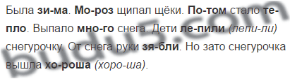 Была зима. Мороз щипал щёки. Потом стало тепло. Выпало много снега. Дети лепили снегурочку. От снега руки зябли. Но зато снегурочка вышла хороша.