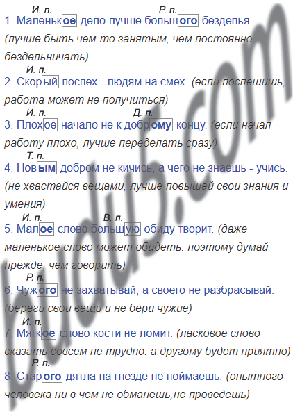 2. Спишите поговорки, вставляя пропущенные буквы, обозначьте падеж прилагательногх, выделите окончания.